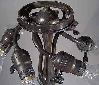The suface of the lamp base and sockets are patinated with brown /dark green- brown Tiffany patina made in our Studio using the original recipe handed down by Tiffany Studios New York. No lacquer is used in the patination process.