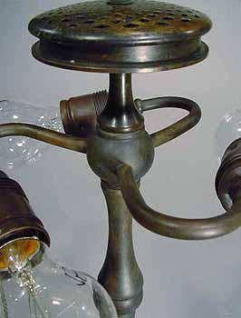 The suface of the lamp base is patinated with brown /dark green- brown Tiffany patina made in our Studio using the original recipe handed down by Tiffany Studios New York. No lacquer is used in the patination process.