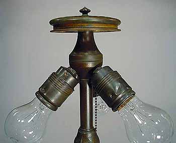 The suface of the lamp base and sockets are patinated with brown /dark green- brown Tiffany patina made in our Studio using the original recipe handed down by Tiffany Studios New York. No lacquer is used in the patination process.