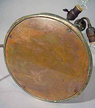 The suface of the lamp base and sockets are patinated with brown /dark green- brown Tiffany patina made in our Studio using the original recipe handed down by Tiffany Studios New York. No lacquer is used in the patination process.