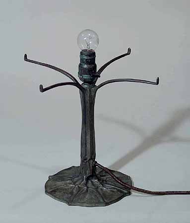 The suface of the lamp base and sockets are patinated with brown /dark green- brown Tiffany patina made in our Studio using the original recipe handed down by Tiffany Studios New York. No lacquer is used in the patination process.