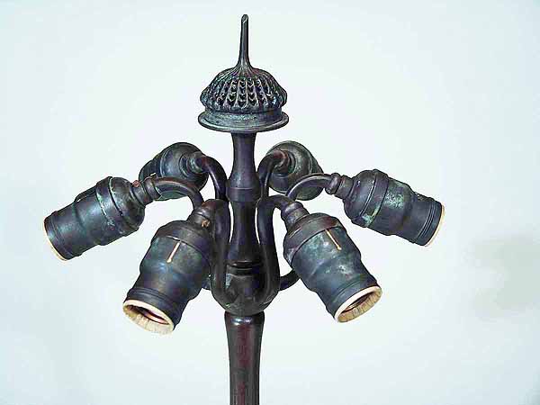 Base is wired according to US safety standards. It comes ready to use in the USA with new old style cloth covered lamp cord and standard US lamp sockets. Other standards of electrification are available at no extra cost. The suface of the lamp base and sockets are patinated with brown /dark green- brown Tiffany patina made in our Studio using the original recipe handed down by Tiffany Studios New York. No lacquer is used in the patination process.