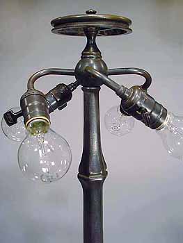 The suface of the lamp base and sockets are patinated with brown /dark green- brown Tiffany patina made in our Studio using the original recipe handed down by Tiffany Studios New York. No lacquer is used in the patination process.