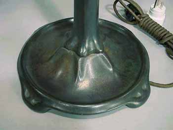 This base is wired according to US safety standards. It comes ready to use in the USA with new old-style cloth covered lamp cord and 4 US turn key lamp sockets. Other standards of electrification are available at no extra cost. The suface of the lamp base and sockets are patinated with brown /dark green- brown Tiffany patina made in our Studio using the original recipe handed down by Tiffany Studios New York. No lacquer is used in the patination process.