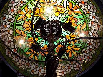 The suface of the lamp base and sockets are patinated with brown /dark green- brown Tiffany patina made in our Studio using the original recipe handed down by Tiffany Studios New York. No lacquer is used in the patination process.
